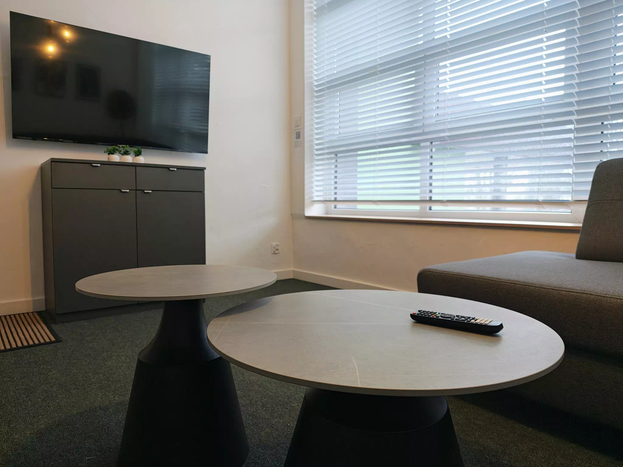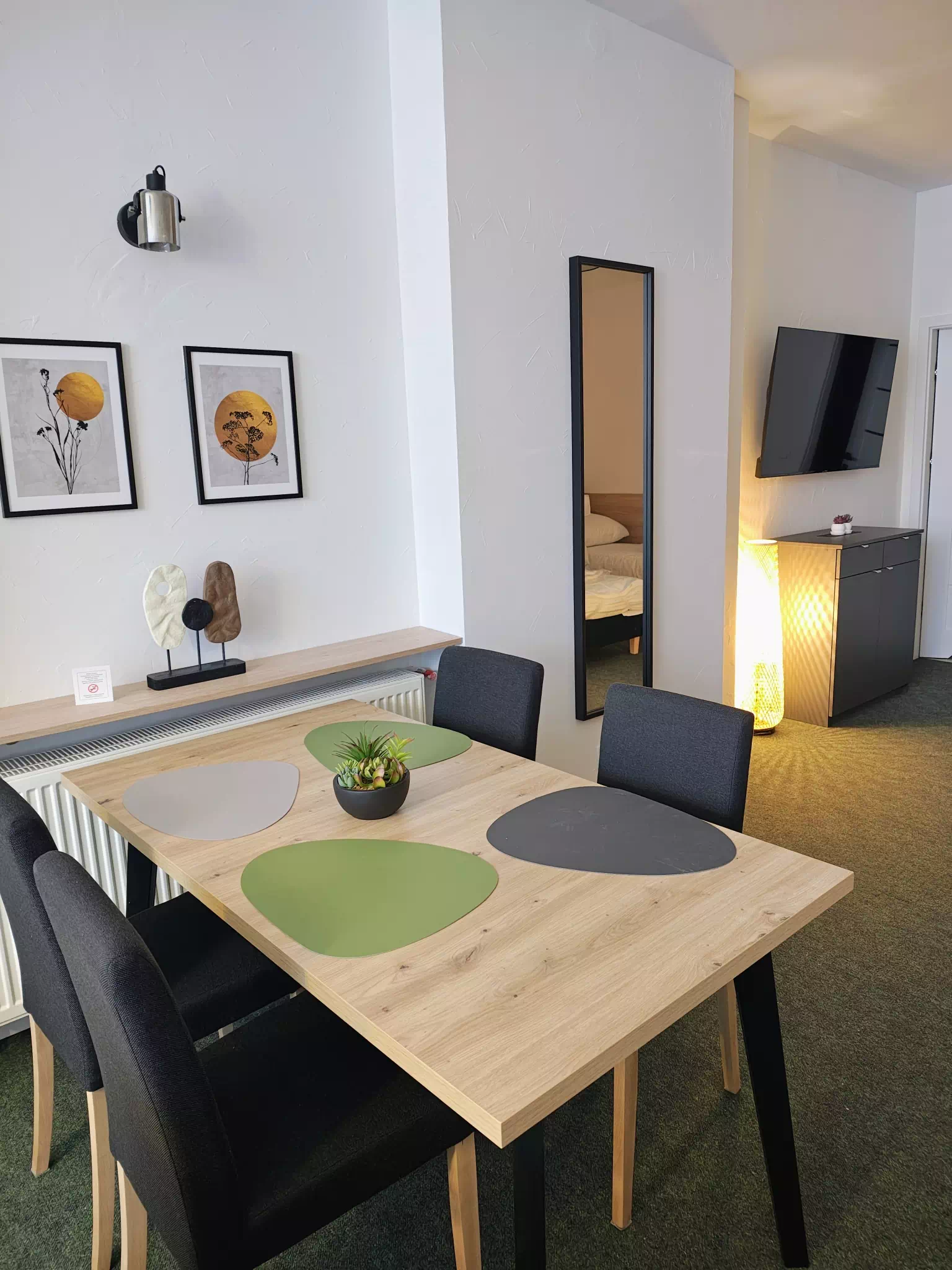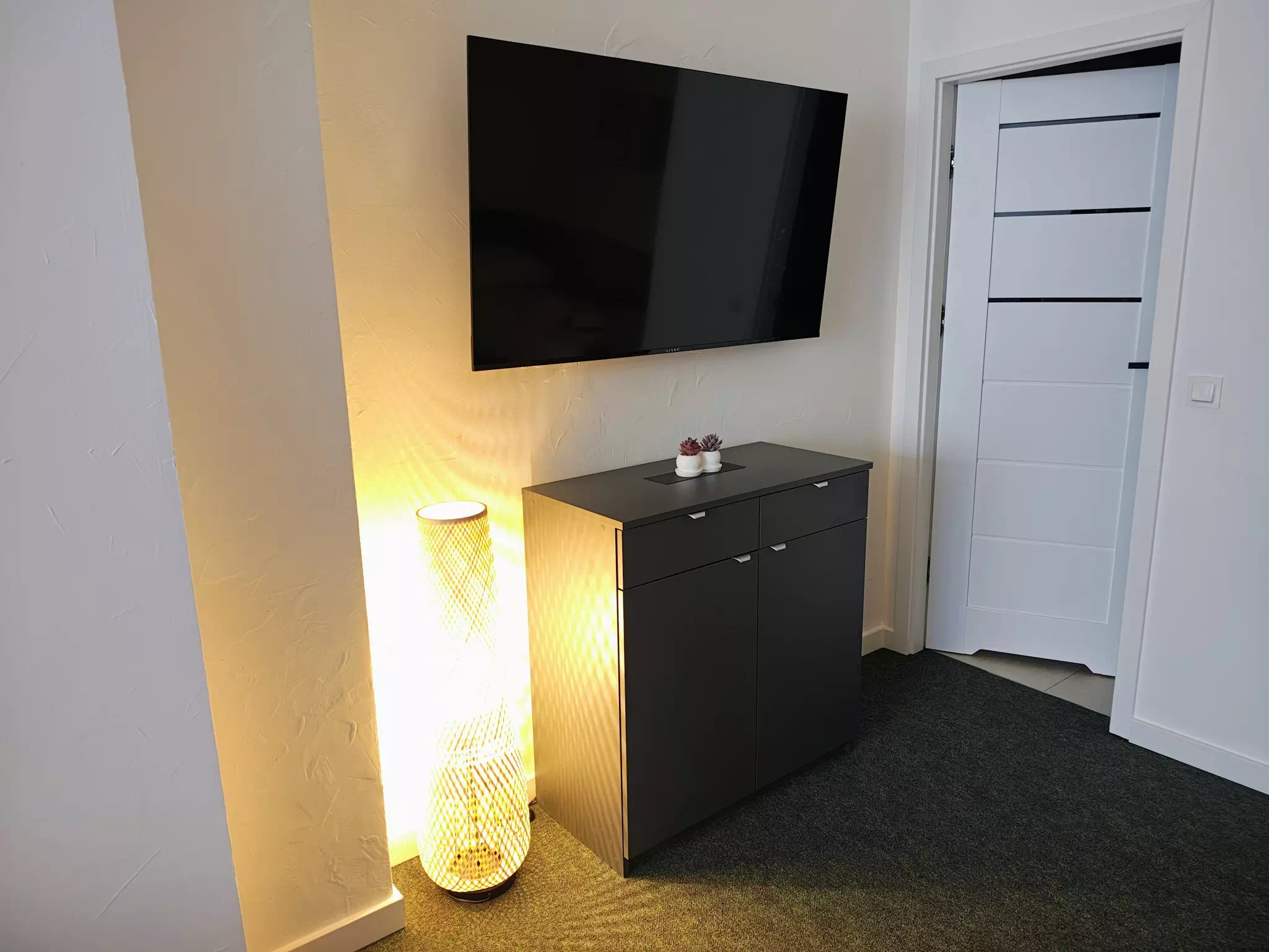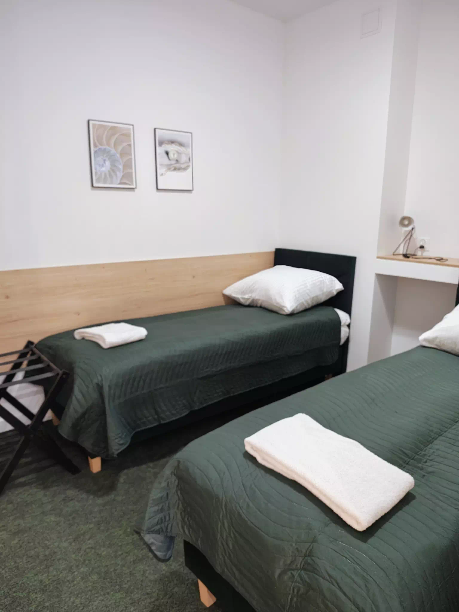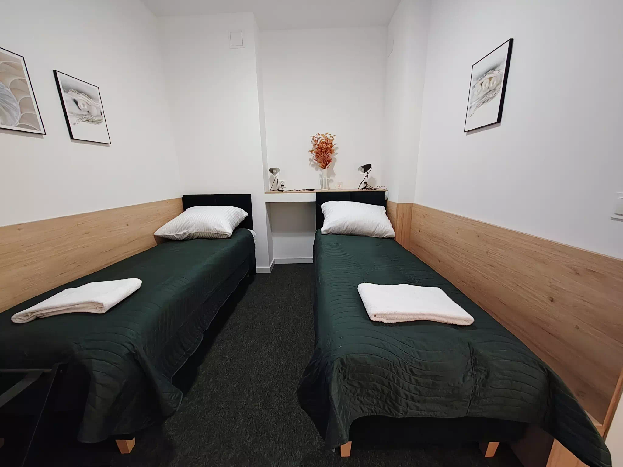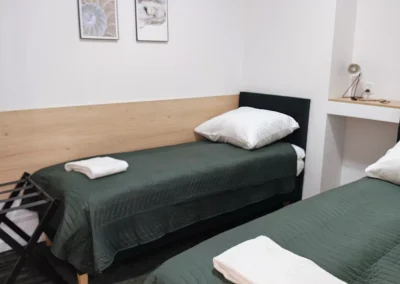 Apartament typu studio o powierzchni 36 m2, z prywatną łazienką. W apartamencie znajdziecie Państwo część wypoczynkową, część kuchenną i część sypialną. W części sypialnej są dwa pojedyncze łózka, które można w prosty sposób ze sobą połączyć. W części wypoczynkowej (dziennej) są podwójna i pojedyncza rozkładana sofa. Apartament wyposażony jest w aneks kuchenny wraz z kompletem zastawy stołowej i naczyń, lodówkę z zamrażarką, kuchenkę mikrofalową, czajnik elektryczny oraz kawę, herbatę i małą słodycz do kawy. W apartamencie jest szafa na ubrania, dwie komody, żelazko i deska do prasowania. Nasi goście na dwóch dużych telewizorach – w części dziennej i sypialnej mogą oglądać programy z naziemnej telewizji cyfrowej.