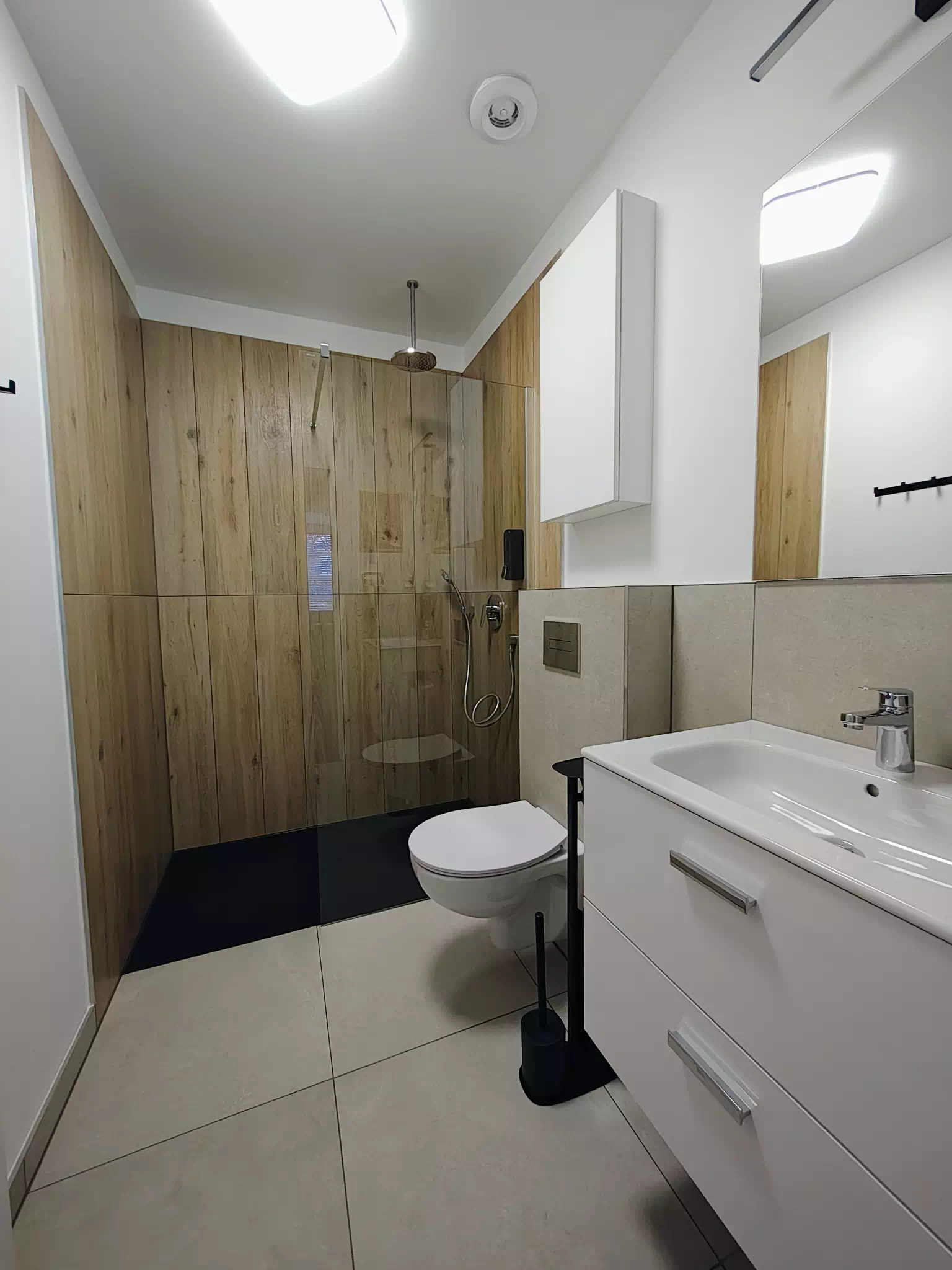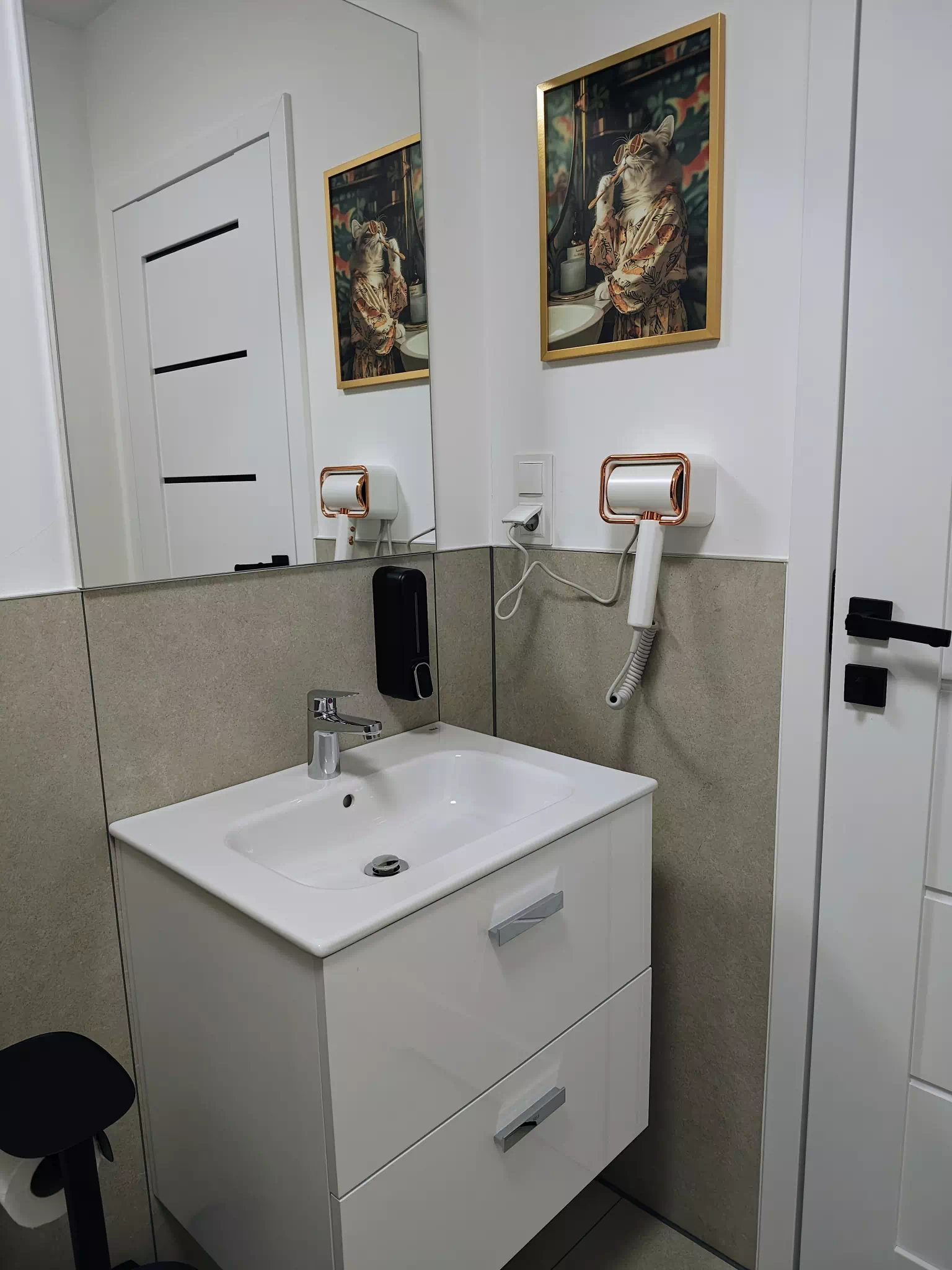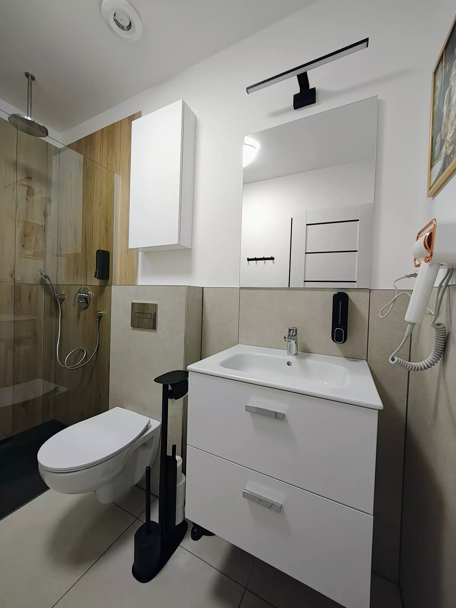 W łazience jest bezprogowy prysznic, toaleta, umywalka i suszarka do włosów.