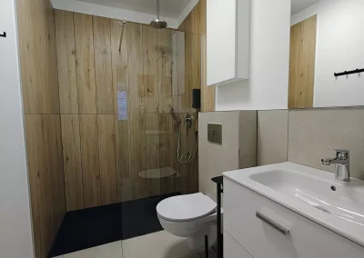 W łazience jest bezprogowy prysznic, czepek kąpielowy, torba na brudną bieliznę, toaleta, umywalka, suszarka do włosów oraz mydło do ciała.